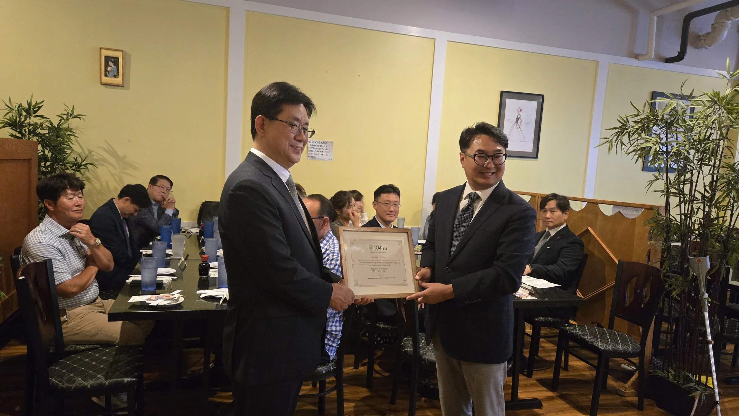 The event concluded with a congratulatory message from Pastor Shim Chang-sup (Fellowship Church, KAFHI Director) and a benediction by Pastor Kim Young-moon (Sae Nal Church). The subsequent dinner included a personal testimony by President Yoo Won-sik, who also introduced KAFHI's ministry. President Yoo, who previously served as the President of Food for the Hungry Korea, is currently the President of KAFHI. He emphasized that KAFHI is a Korean-centric organization jointly created by the Korea and U.S. Food for the Hungry headquarters, and he reiterated the start of the 'KAFHI 2.0' era to expand the U.S. ministry further.